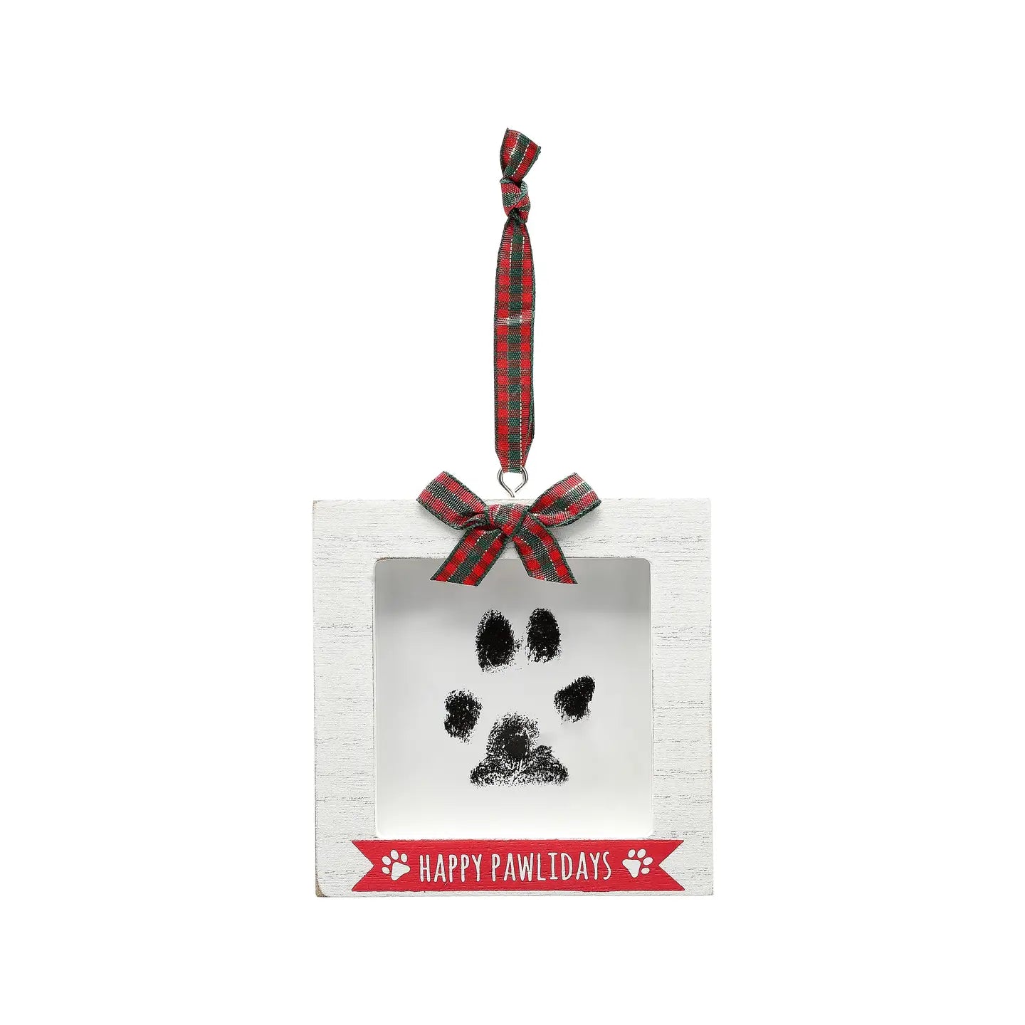 • Includes a rustic ornament frame with red and green festive plaid bow and ribbon for easy hanging, a red and white “happy pawlidays” banner below pawprint insert, an ink pad and two white impression cards