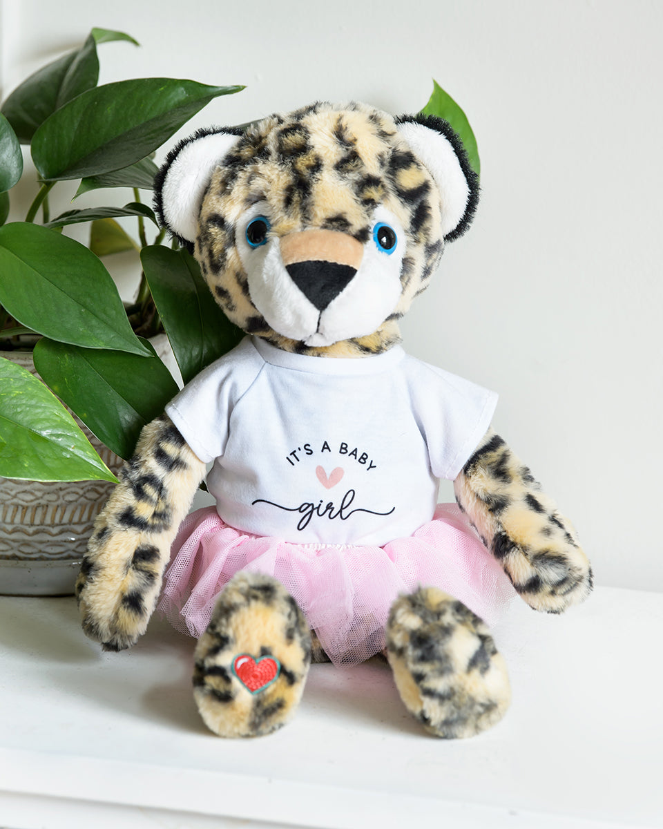 The Vintage Leopard Kit includes a 15" stuffed leopard and an easy-to-use heart-shaped recorder. The leopard is perfect to cuddle, made with a soft fleece-like material with poly fiber stuffing and a velcro closure in the back where the recorded heartbeat or message is secured.