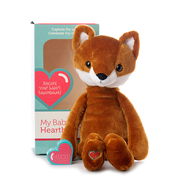 The Vintage Fox Kit includes a 15" stuffed fox and an easy-to-use heart-shaped recorder. The fox is perfect to cuddle, made with a soft fleece-like material with poly fiber stuffing and a velcro closure in the back where the recorded heartbeat or message is secured.