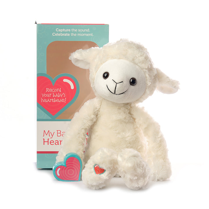 The Vintage Lamb Kit includes a 15" stuffed lamb and an easy-to-use heart-shaped recorder. The lamb is perfect to cuddle, made with a soft fleece-like material with poly fiber stuffing and a velcro closure in the back where the recorded heartbeat or message is secured.