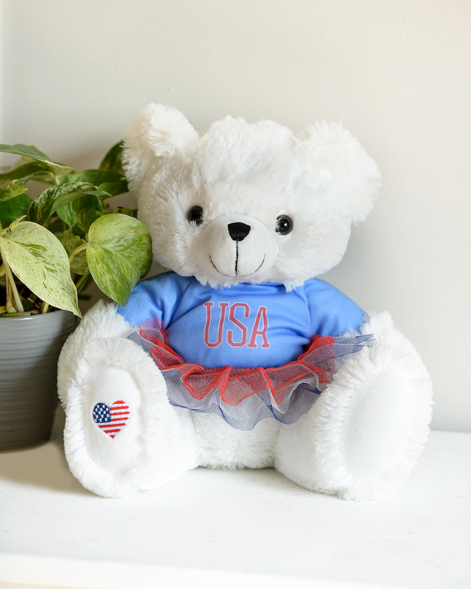 The USA Bear Kit includes an adorable 13" stuffed bear and an easy-to-use heart-shaped recorder. The bear is perfect to cuddle, made with a soft fleece-like material with poly fiber stuffing and a velcro closure in the back where the recorded heartbeat or message is secured.